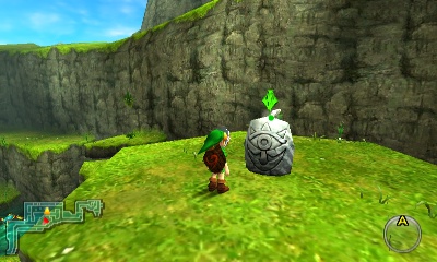 One of the biggest changes is the touch-screen interface, which allows the player to easily access the map, inventory, and items without pausing the game. The 3DS version also adds gyroscopic controls, which let the player aim the slingshot, bow, hookshot, and other items by tilting the system. Additionally, the 3DS version has a hint system, called Sheikah Stones or Gossip Stones, which provide visions of part of a quest or obtainable upgrade the player has not found yet.