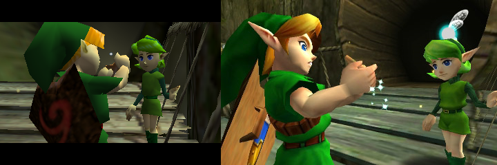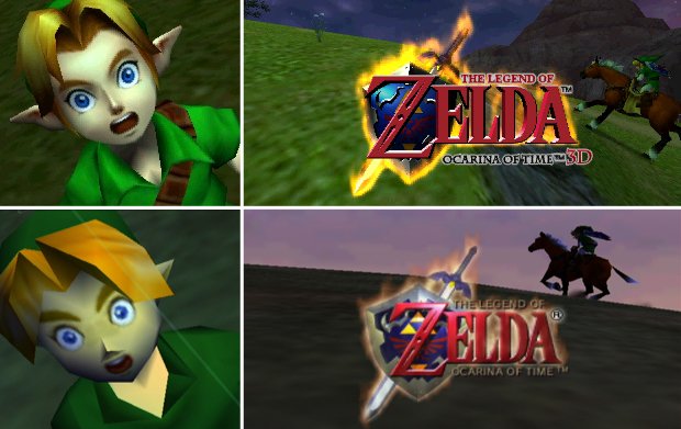 The most obvious difference between the N64 and 3DS versions is the graphics. The 3DS version is the first port of Ocarina of Time that recreates the graphics, instead of simply porting over the N64 ones, to take advantage of the more powerful hardware and fit modern standards. The result is a much more colorful, detailed, and smooth-looking game, with improved character models, textures, lighting, and animations. The 3DS version also supports stereoscopic 3D, which adds depth and immersion to the game world.